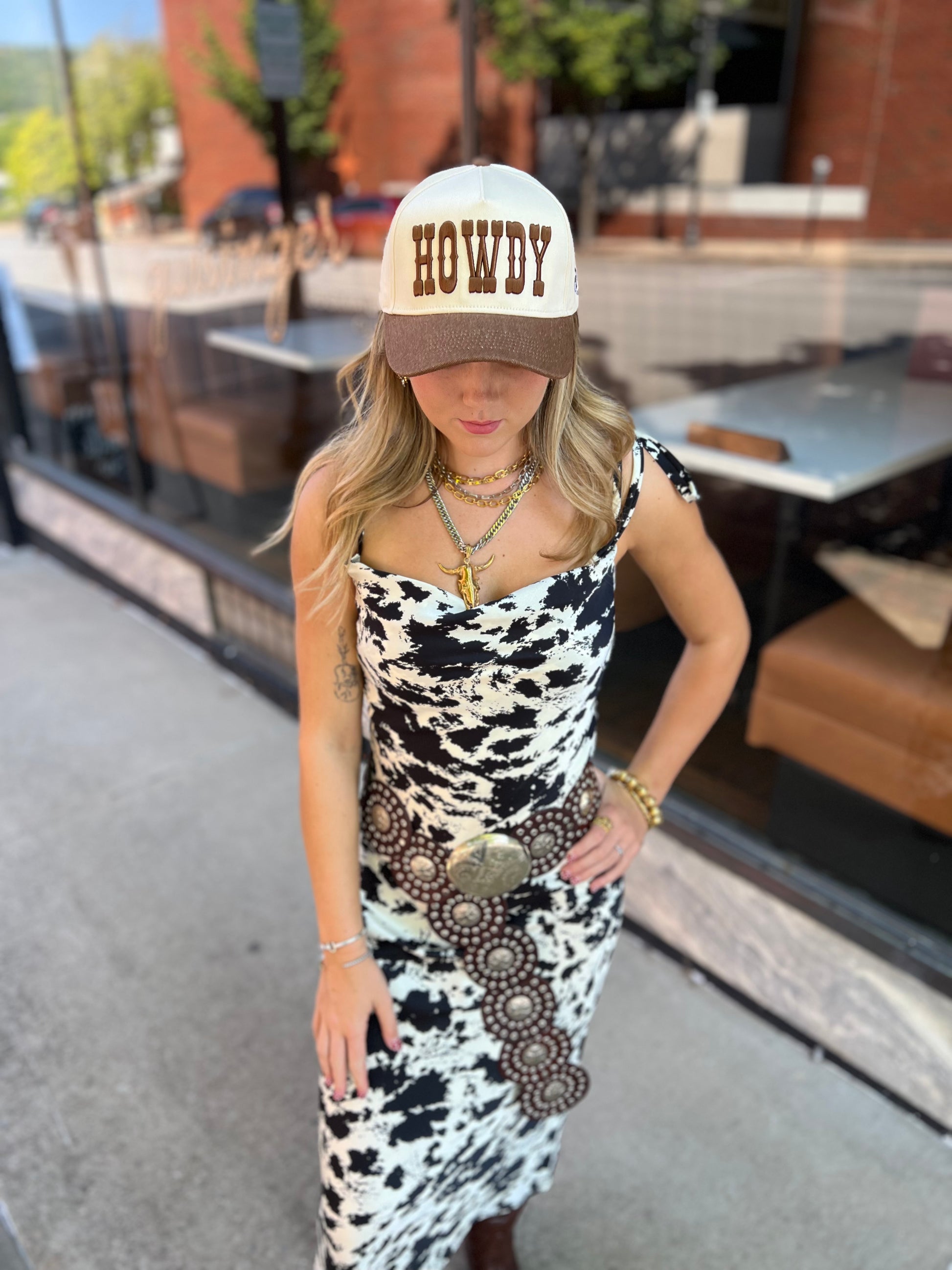 Brown denim and natural trucker hat with 3D embroidery. Horseshoes embroidered on the left side of hat.